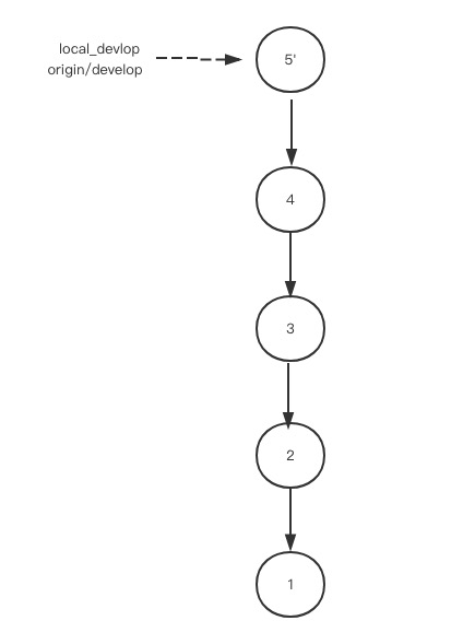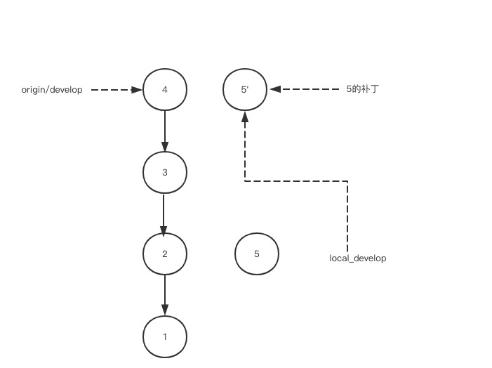 第二个步骤是在要合并到的分支(origin/develop)的最新的commit的基础上应用这些补丁。也就是把4和5’进行合并,然后推送代码 git push.