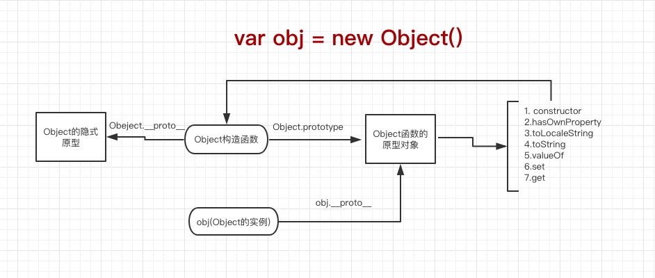 var obj = {} 每个构造函数都有一个原型对象,通过prototype去访问,比如Object.prototype,然后这个原型对象包含一个constructor属性,指向构造函数,也就是Object.prototype.constructor === Object,还包含了一些内置函数,或者自定义的函数。