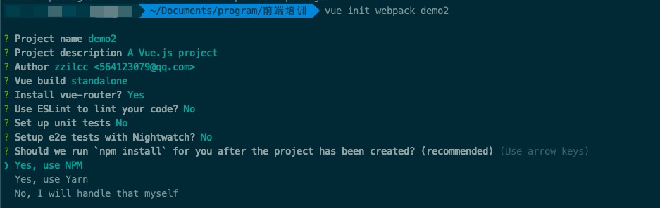 可以看到,我们安装vue-cli 模版的时候可以选择安不安装Vue-Router,在这边我们选择yes。