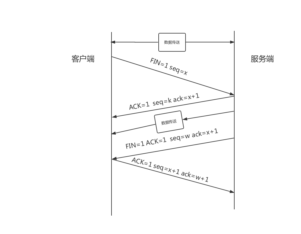 - 首先客户端数据传递完成发起关闭连接请求,FIN=1,seq=x,x等于上一个客户端接收的报文的序号+1
