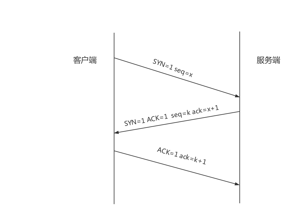 - 然后服务端接收到后返回报文ACK=1,seq=k,ack=x+1,告诉客户端序号为x的包我已经接收到了,期待下次接收到x+1序号的包,然后服务端本次的序号是k