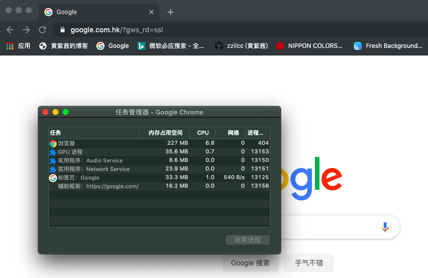 现在市面上大多数的浏览器都是多进程的。以谷歌为例,我们开始打开一个页签,这里我打开了谷歌搜索。我们可以看到一开始就有5个进程。