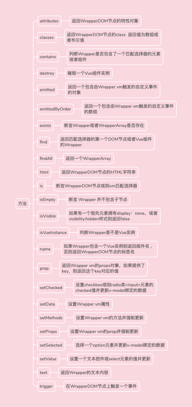 一个 Wrapper 是一个包裹器,它包括了一个挂载组件或 vnode,以及测试该组件或 vnode 的方法。
